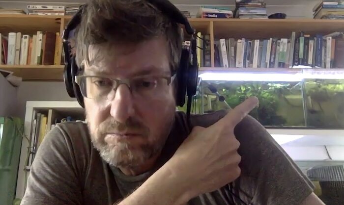 Author Adam Welz points to his fish tank with endangered catfish from Peru.