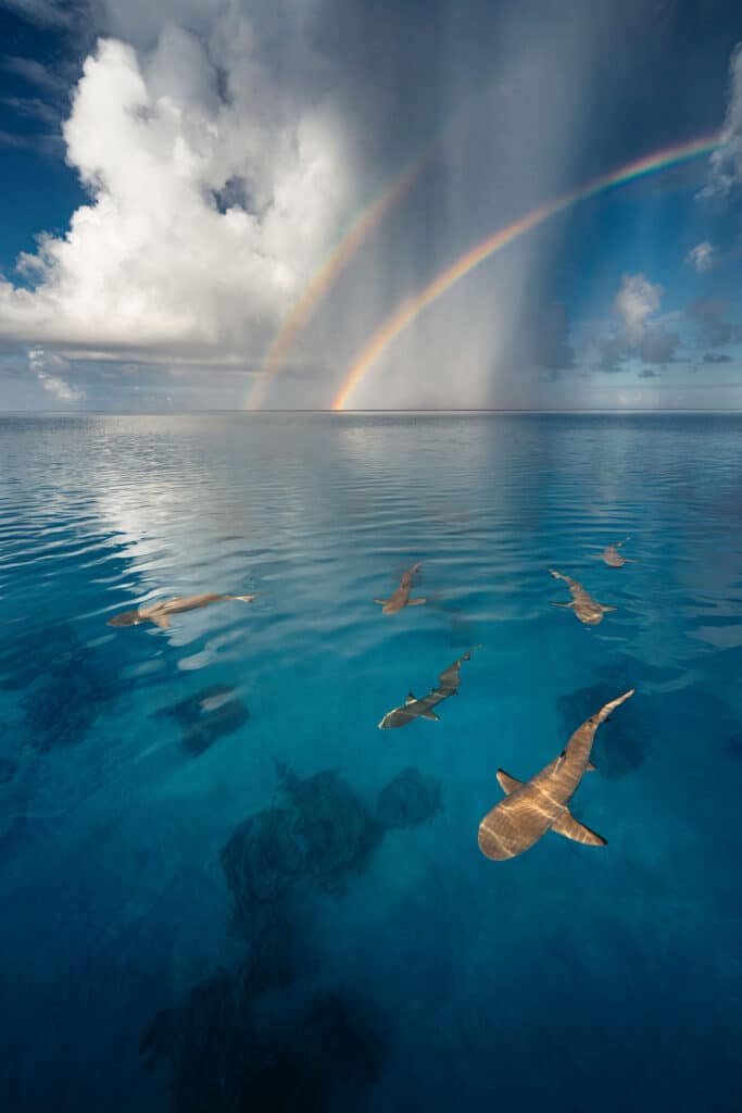 “On our first night in the Tuamotus (French Polynesia), we stopped in Tahanea – an uninhabited atoll deep in this stunning archipelago,” Sparling said in a statement. “We had a perfectly windless evening where the ocean turned to glass. The next morning, the water was still glassy and a group of black tip reef sharks patrolled the waters around our boat. Rainbows and sharks are common subjects in the Tuamotus, two things I’ll never get used to.”