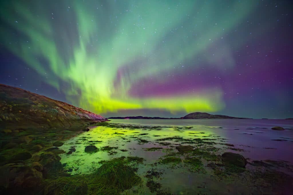 “Sitting at the rocky shore in Norway watching northern lights and their reflection in the sea surface with friends – what more do you want?!” Sswat asked. “In this case, we even had more beautiful nature to experience, as earlier in the day, we were diving through canyons into incredible kelp forests meeting lobsters and nudibranchs, in the Namsfjord, off the village of Utvørda, north of Trondheim (Norway). (No more wishes).”