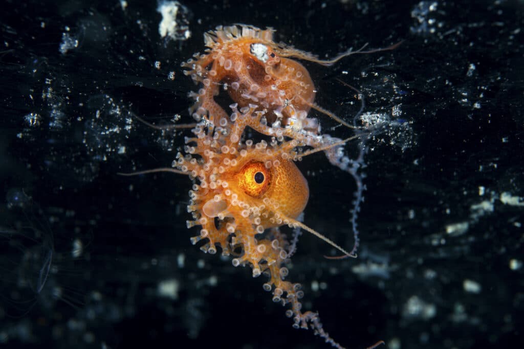“This is a Juvenile Football Octopus (Ocythoe tuberculata), a pelagic octopus species that usually lives in mid water around 200m depth where they are the favourite prey of lancetfishes and rissos dolphins,” Middleton said. “The juveniles are occasionally encountered near the surface, where they often use large salps as protection. I saw a handful in salps on this day at the Poor Knights Islands off New Zealand’s northeastern coast, but this was the only free swimming juvenile I encountered.”
