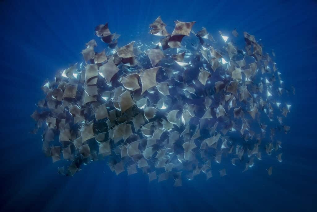 “One day we found a vortex of them in deep, blue waters,” Mignon said. “They were circling and swimming in union. It felt like a beautiful, hypnotic dance. Seeing such big aggregations can lead [one] to think that their populations are doing well. Unfortunately Mobula munkiana are listed as vulnerable on the IUCN red list.”